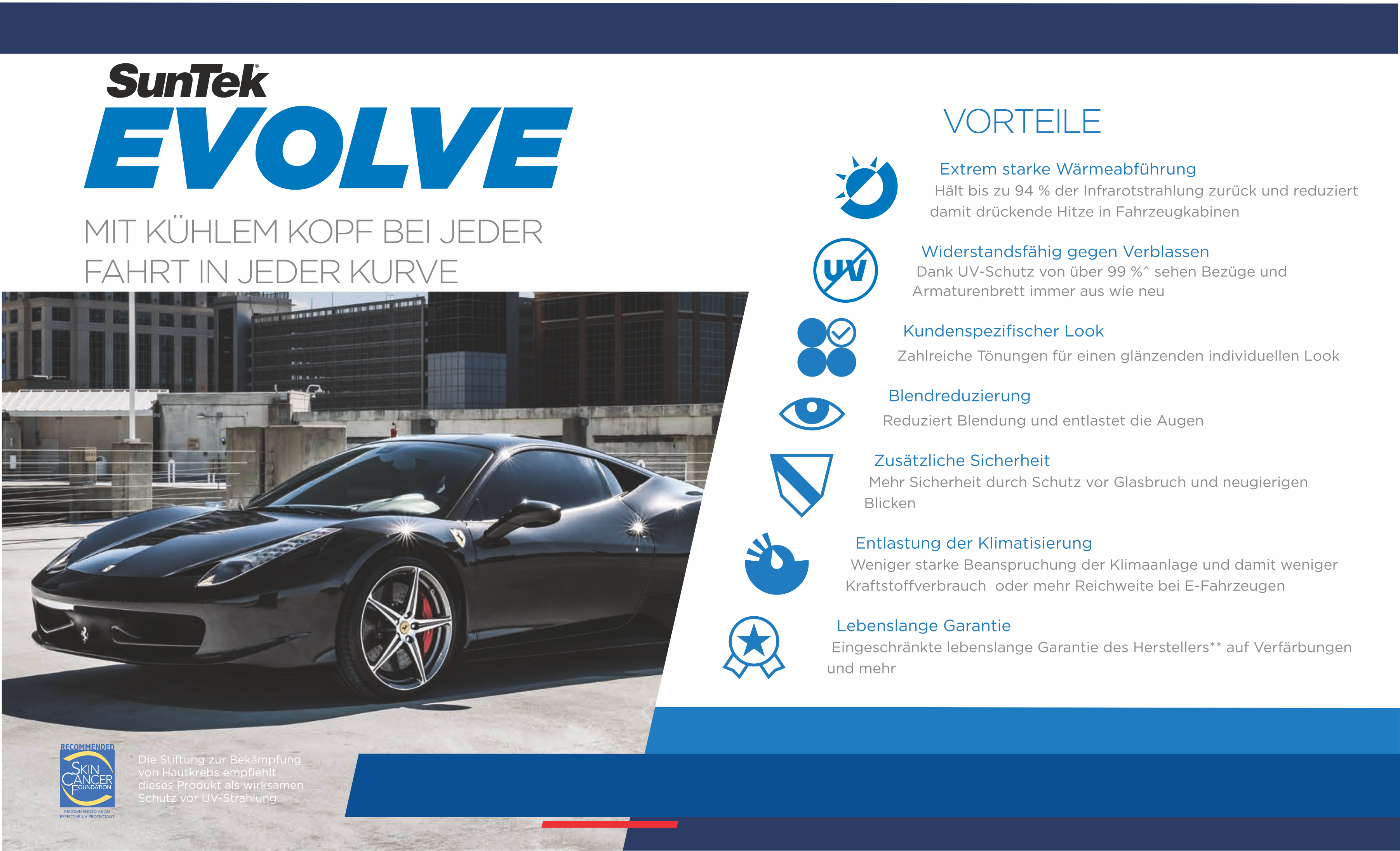 Wenn Sie die beste Leistung und Wärmeabweisung wünschen, entscheiden Sie sich für SunTek Evolve – unsere nächste Evolutionsstufe der Ceramic Tönungsfolie.